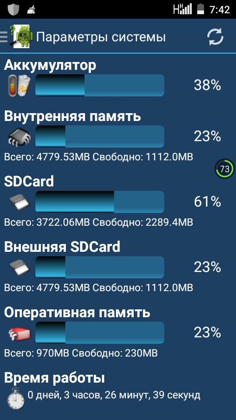 - Панель инструментов (данные батареи, внутренней и sd-card памяти и т.д.)