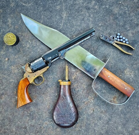 6-зарядный капсюльный револьвер "COLT MODEL 1851 NAVY" с 7,5" стволом 36 калибра в компании ножа CONFEDERATE GUARD BOWIE KNIFE от CRAZY CROW с 11,5" клинком.
